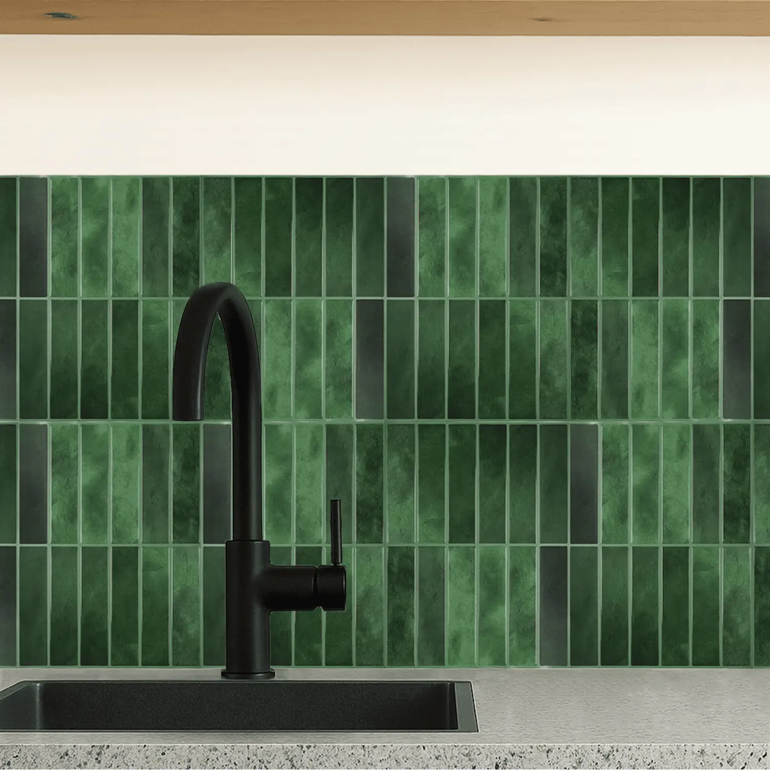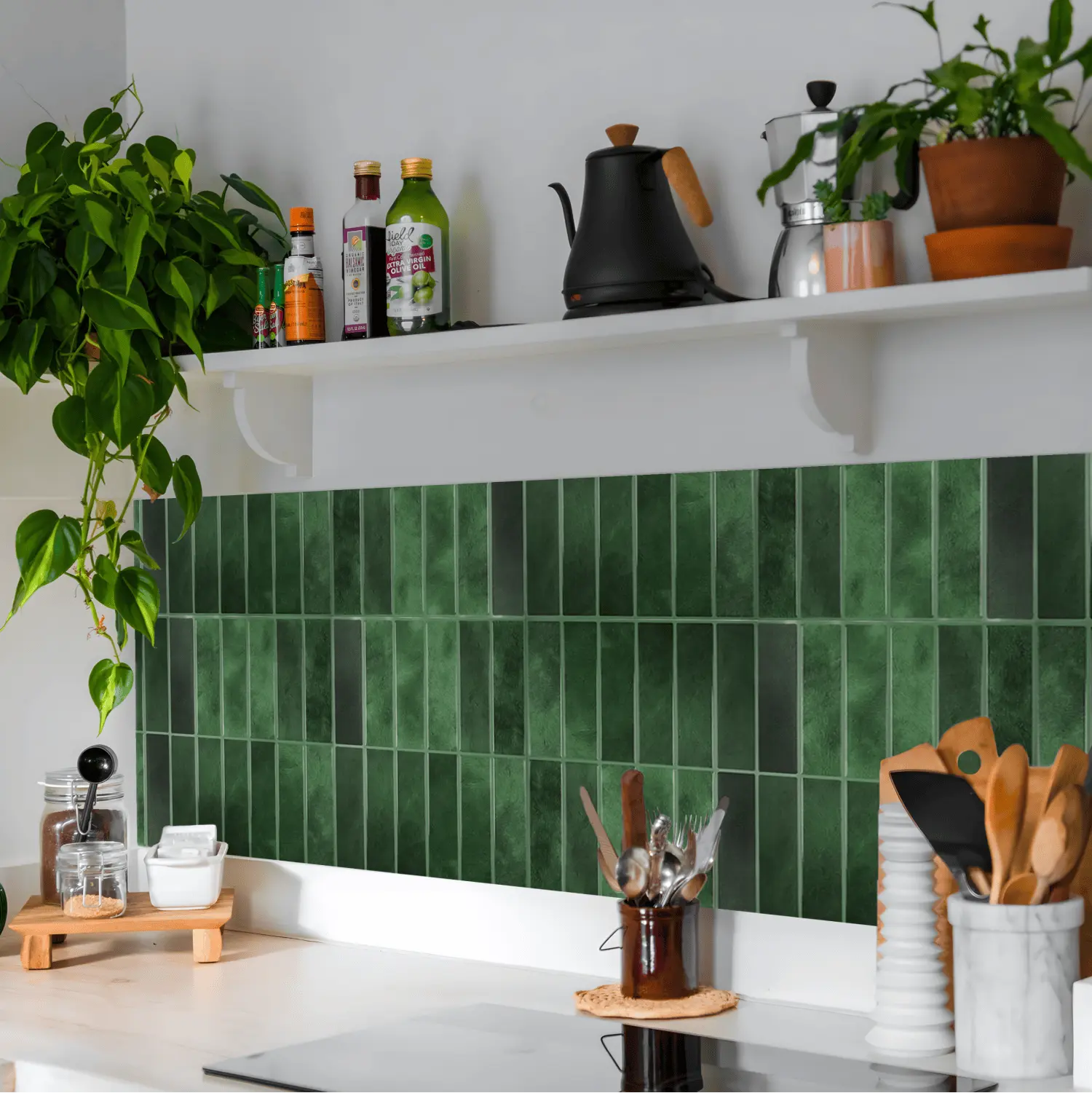 Geef je muur een frisse uitstraling met plaktegels Stretti mosgroen (donkergroen). Zelfklevend, waterbestendig en in 10 minuten aangebracht.